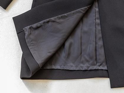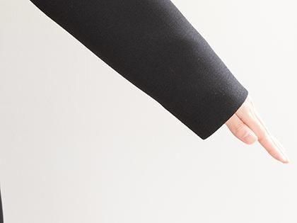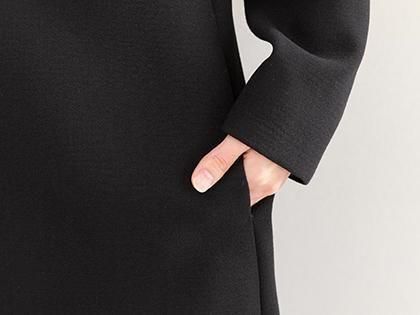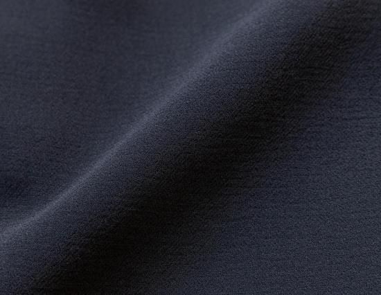 中薄地でソフトな肉厚感のある上質なポリエステルダブルジョーゼット。やわらかくきめ細やかで、しなやかなコシがあり、美しいドレープができます。肌触りよくしわになりにくいのでフォーマルウェアに最適。マットなブラックです。 ポリエステル100% 日本製生地裏地付き(袖は裏地なし):キュプラ100%